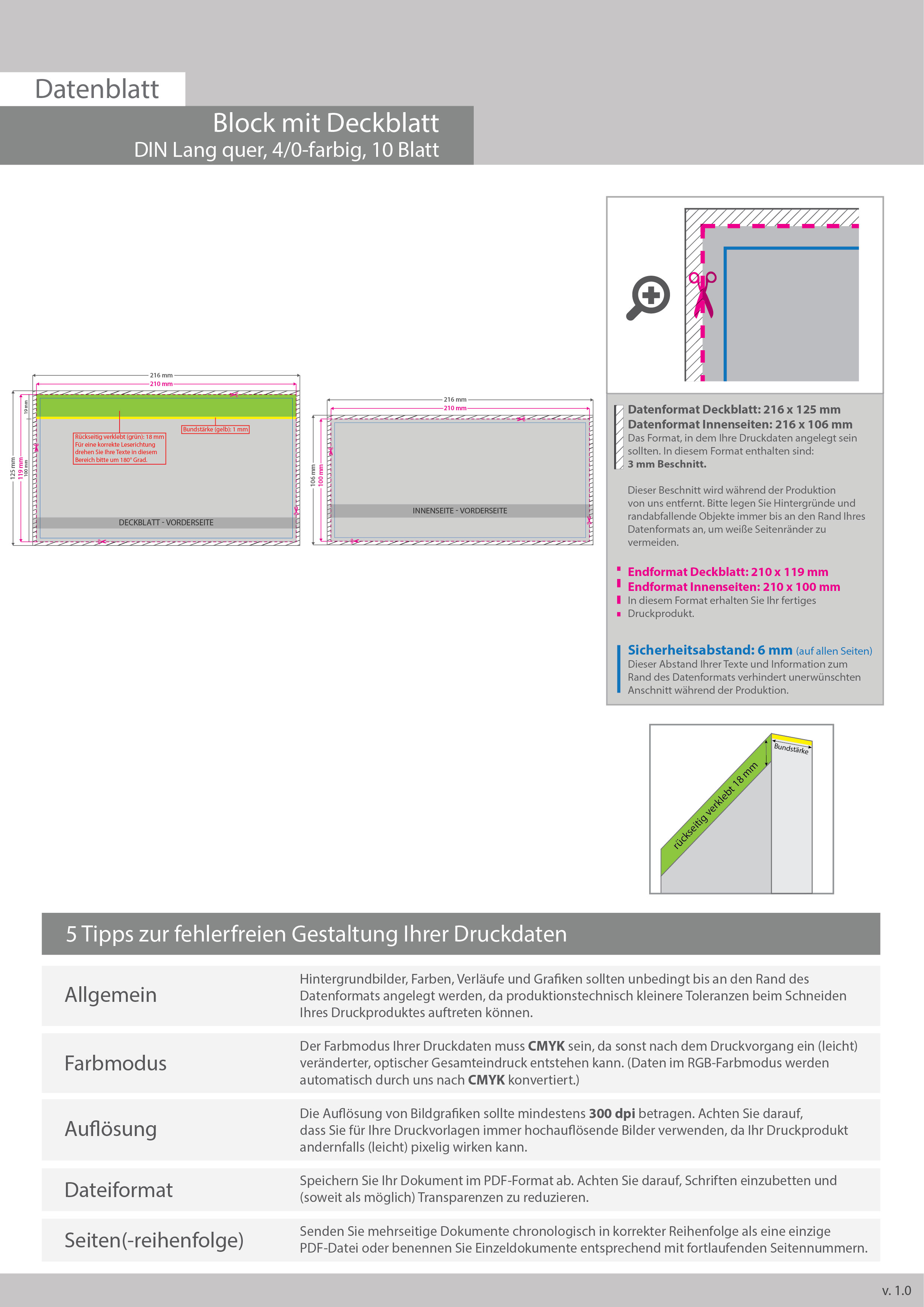 Block mit Leimbindung und Deckblatt, DIN lang quer, 10 Blatt, 4/0 farbig einseitig bedruckt