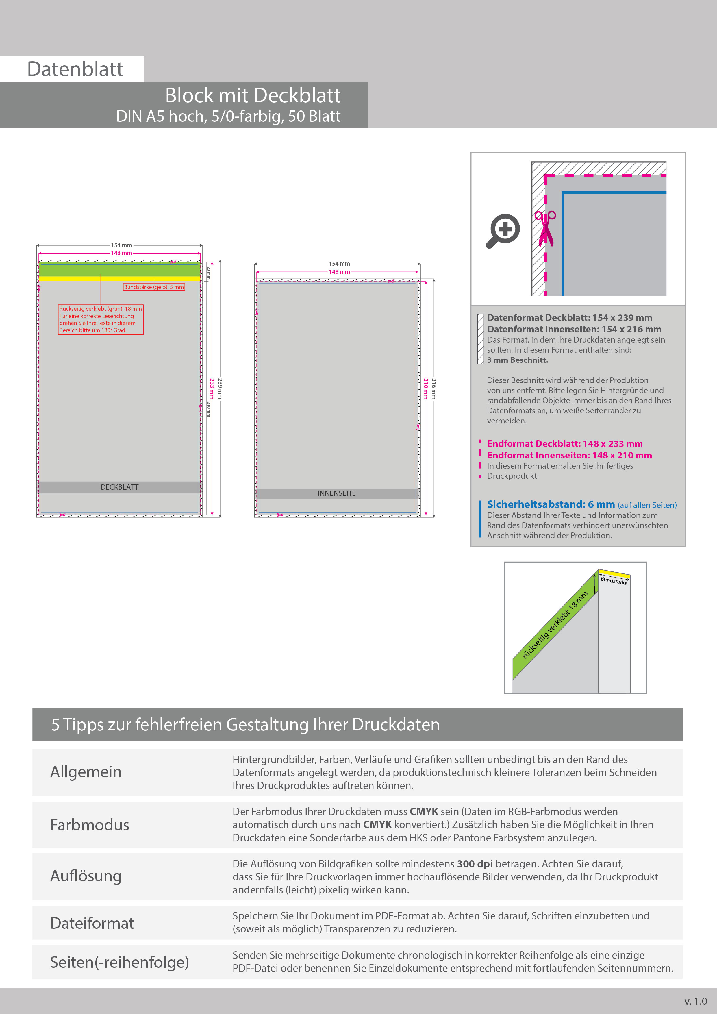 Block mit Leimbindung und Deckblatt, DIN A5, 50 Blatt, 5/0 farbig einseitig bedruckt (CMYK 4-farbig + 1 Sonderfarbe HKS oder Pantone)