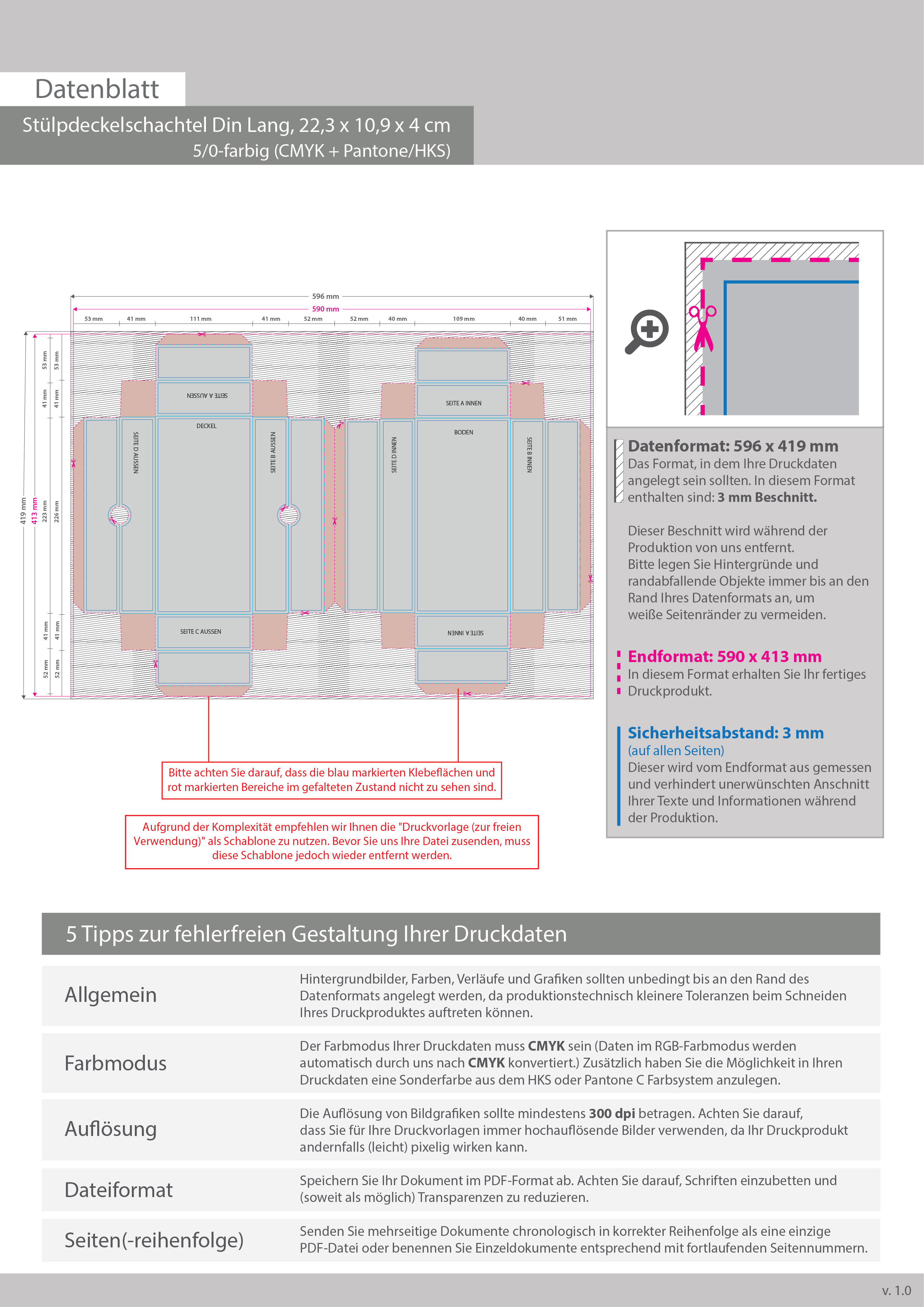 Stülpdeckelschachtel DIN Lang (22,3 x 10,9 x 4 cm), einseitig bedruckt 5/0-farbig (CMYK + Silber)