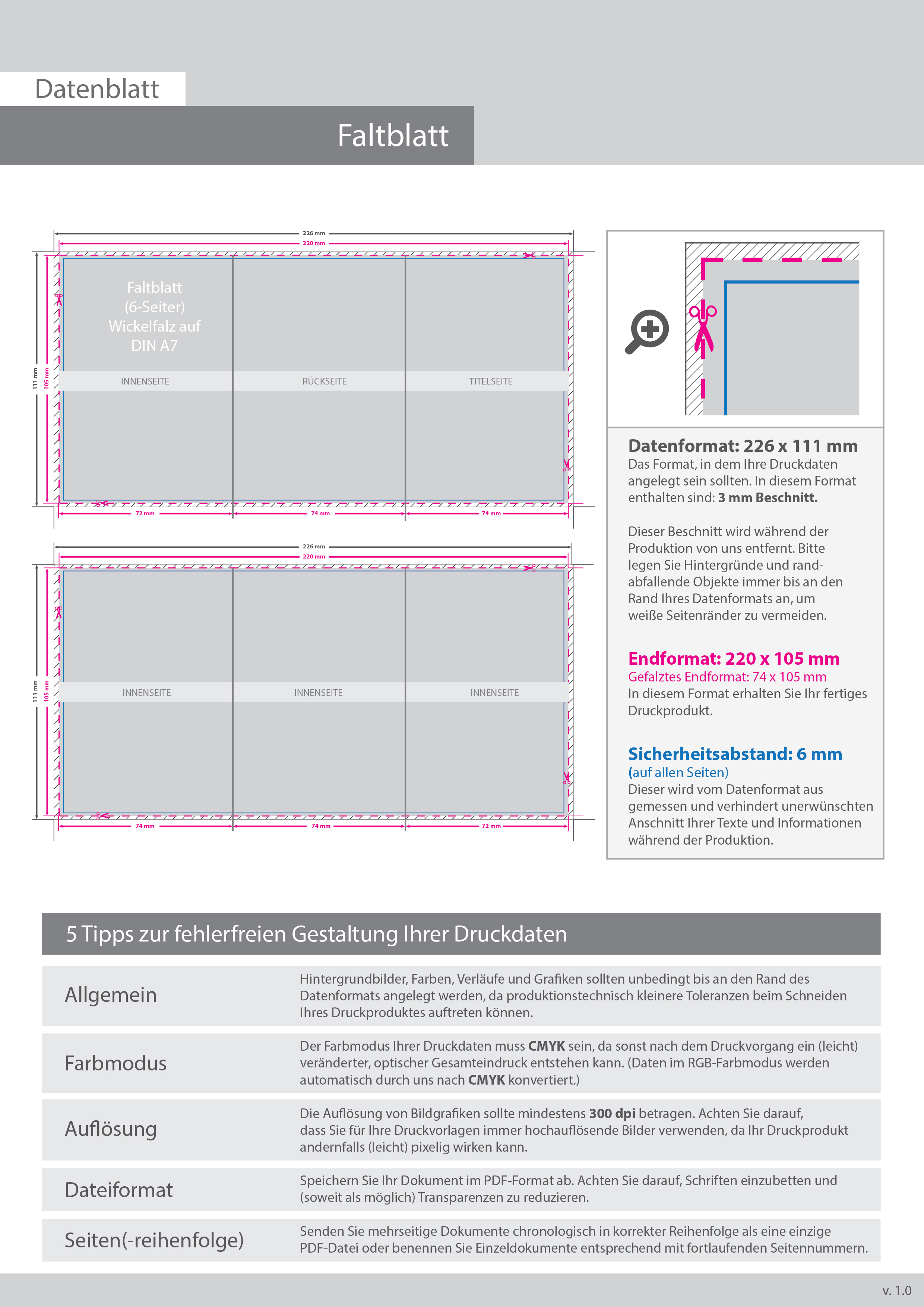 Faltblatt, gefalzt auf DIN A7, vertikaler Wickelfalz, 6-seitig