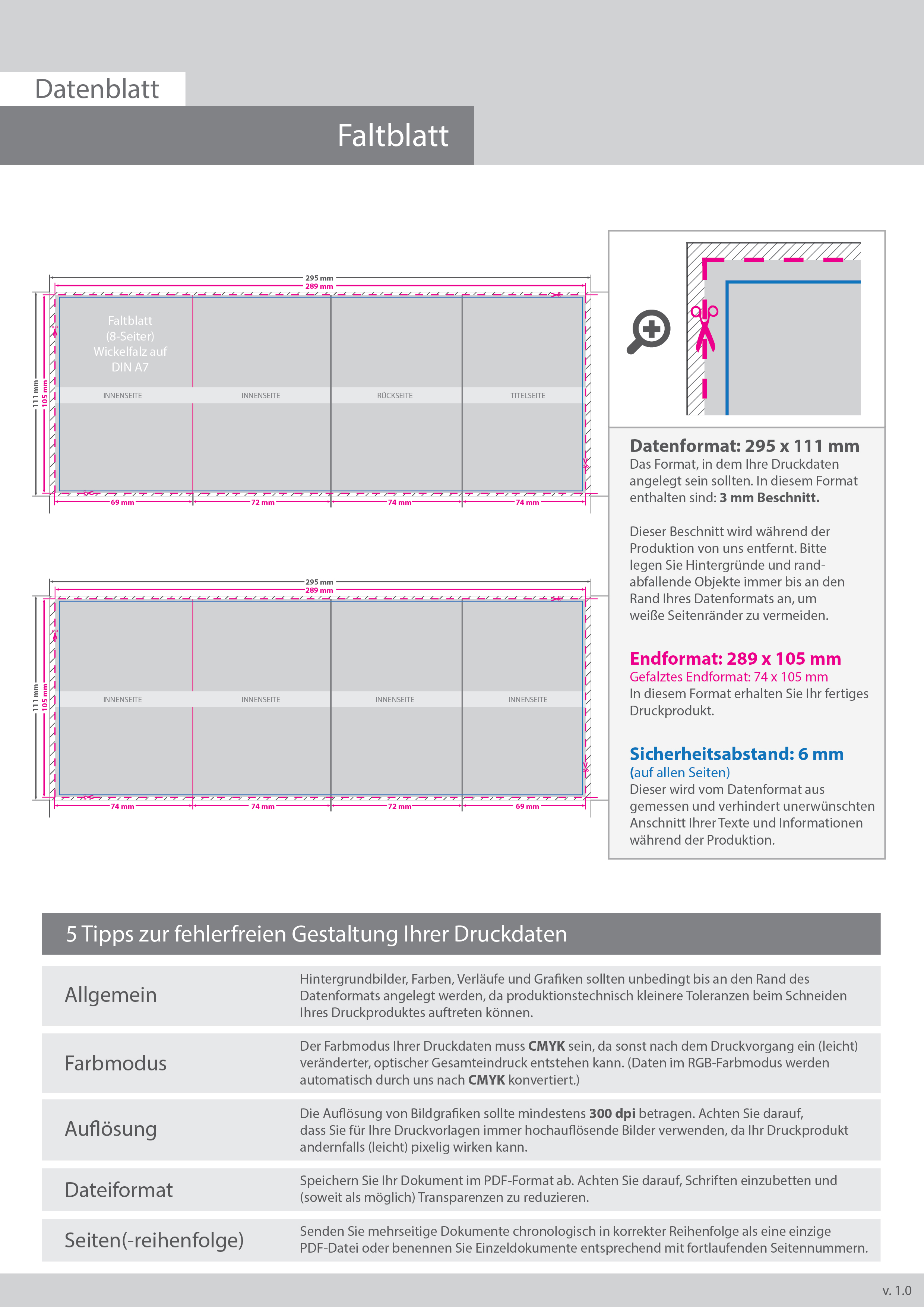 Faltblatt, gefalzt auf DIN A7, vertikaler Wickelfalz, 8-seitig
