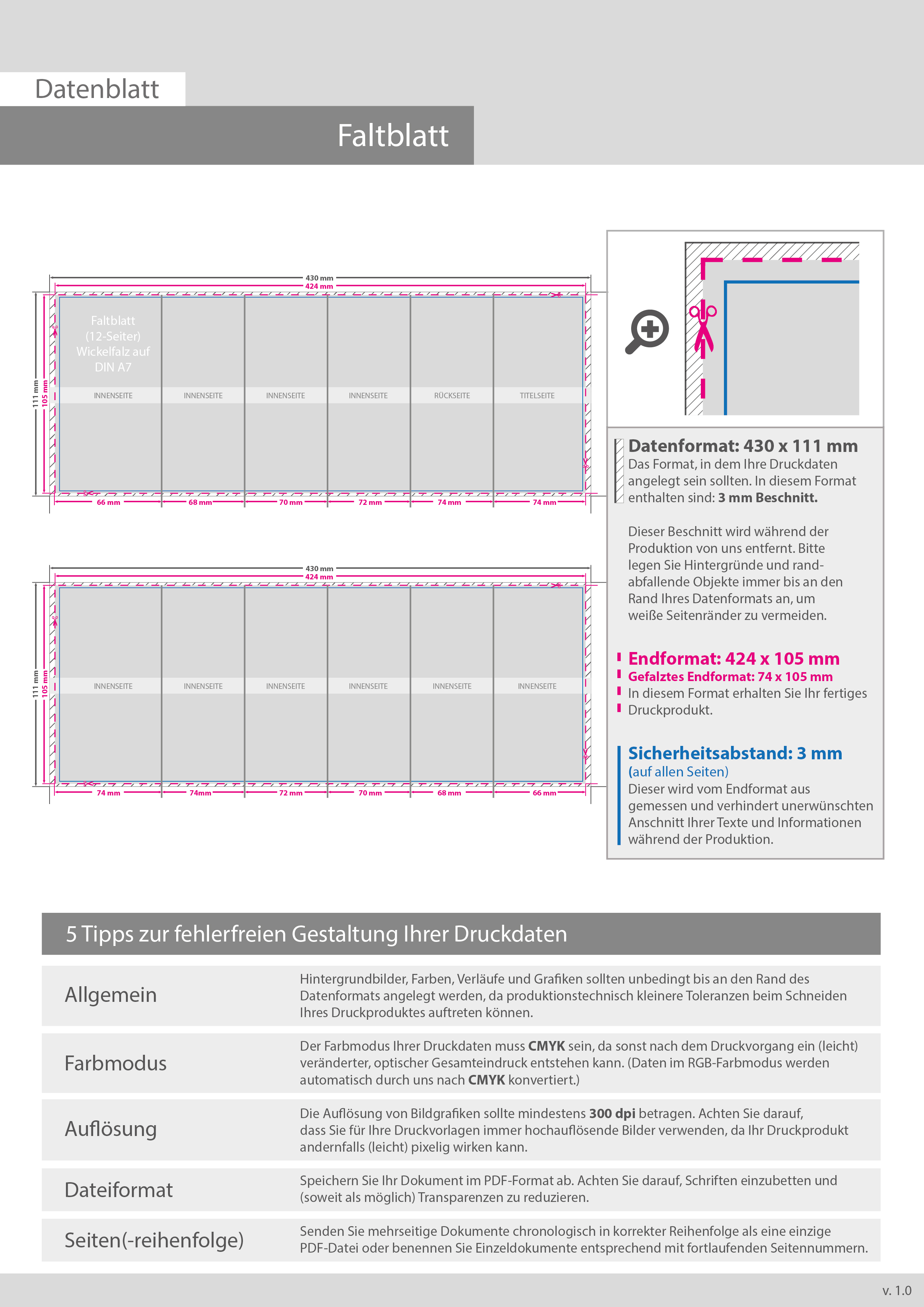 Faltblatt, gefalzt auf DIN A7, vertikaler Wickelfalz, 12-seitig