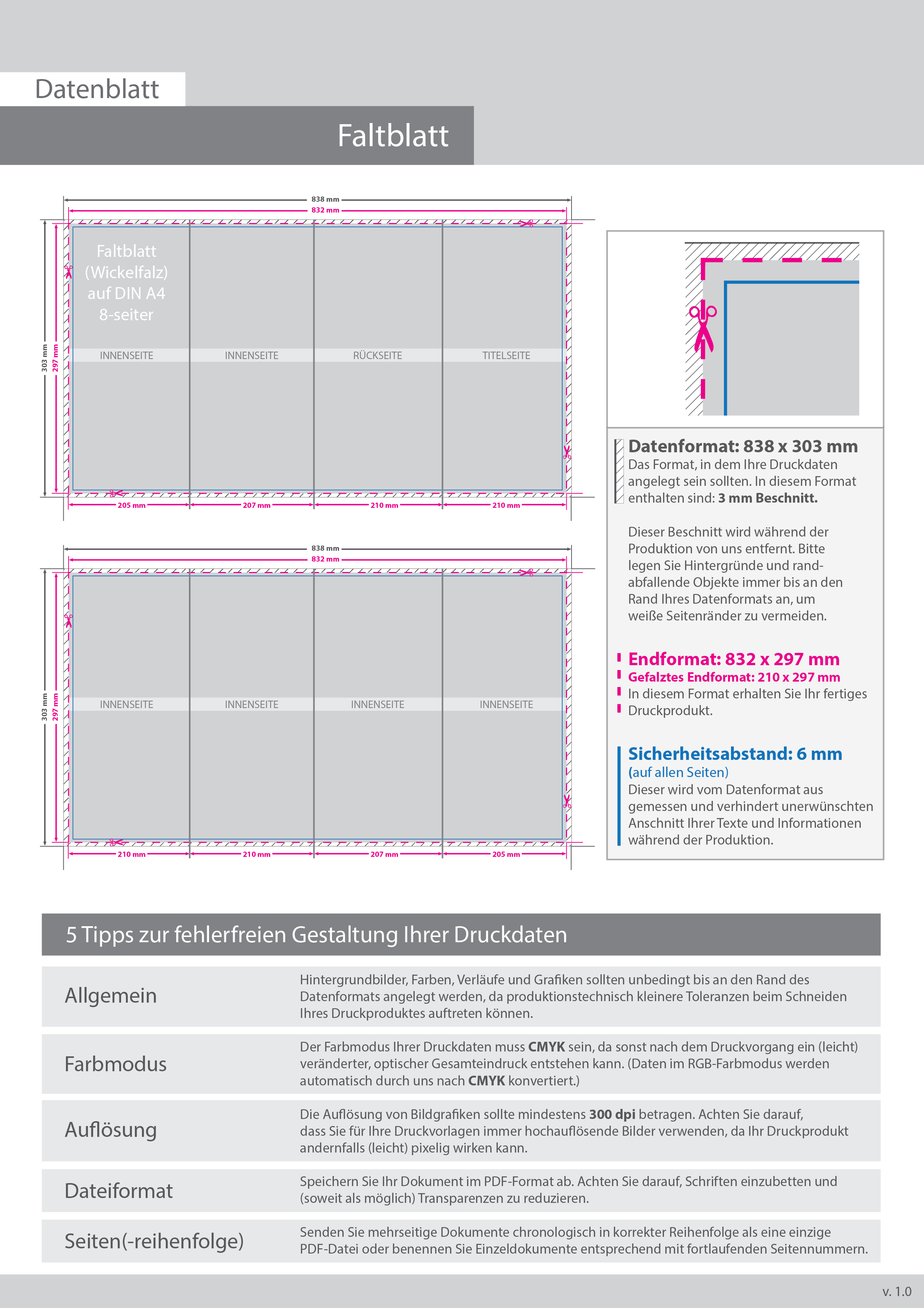 Faltblatt, gefalzt auf DIN A4, vertikaler Wickelfalz, 8-seitig