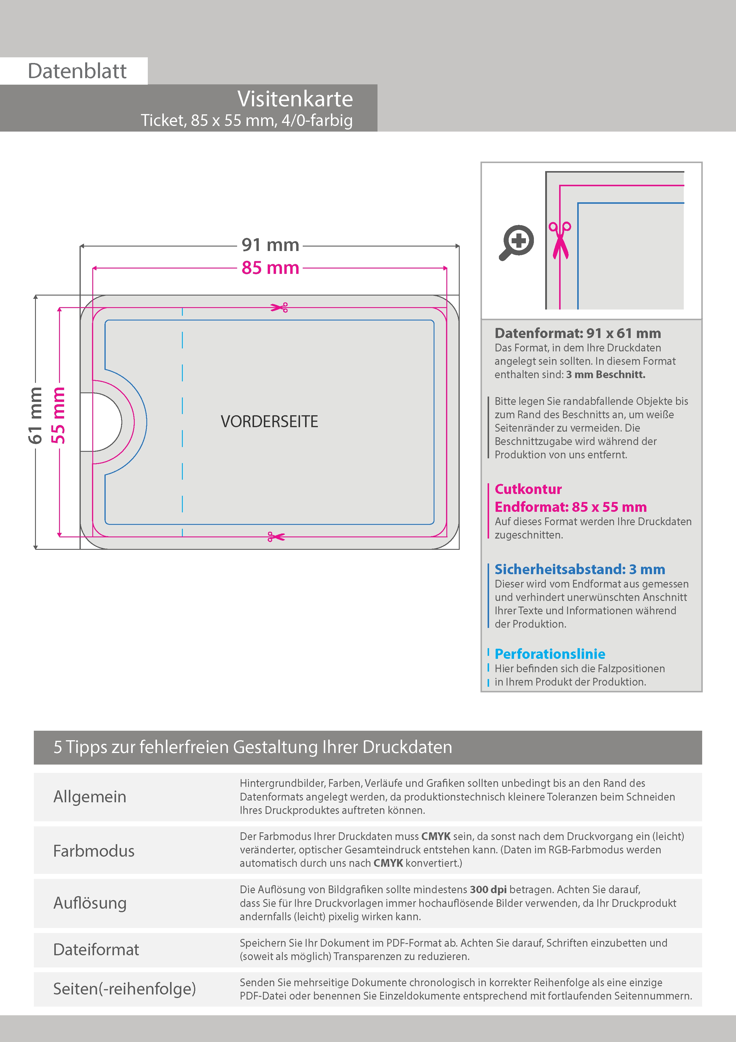 Visitenkarte Ticket, 85 x 55 mm, 1-seitig, 4/0-farbig CMYK